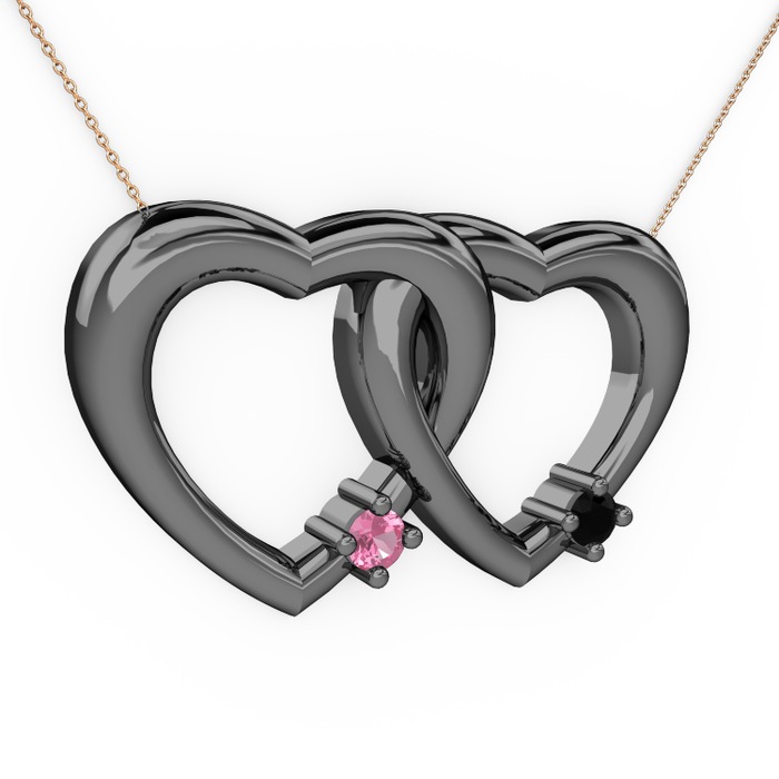 Pembe kuvars ve siyah zirkon 925 ayar siyah rodyum kaplama gümüş kolye (40 cm rose altın rolo zincir)