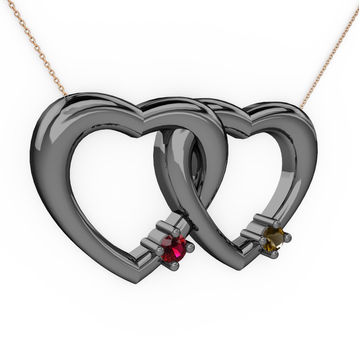 Rodolit garnet ve dumanlı kuvars 925 ayar siyah rodyum kaplama gümüş kolye (40 cm rose altın rolo zincir)