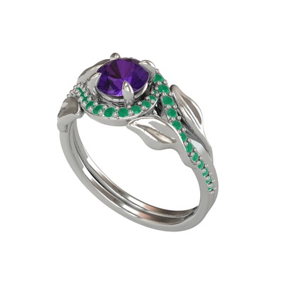 Ametist ve kök zümrüt 14 ayar beyaz altın yüzük