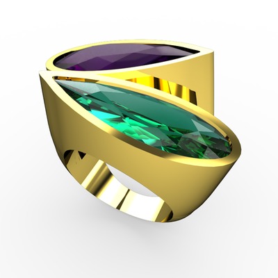 Ametist ve yeşil kuvars 925 ayar altın kaplama gümüş yüzük