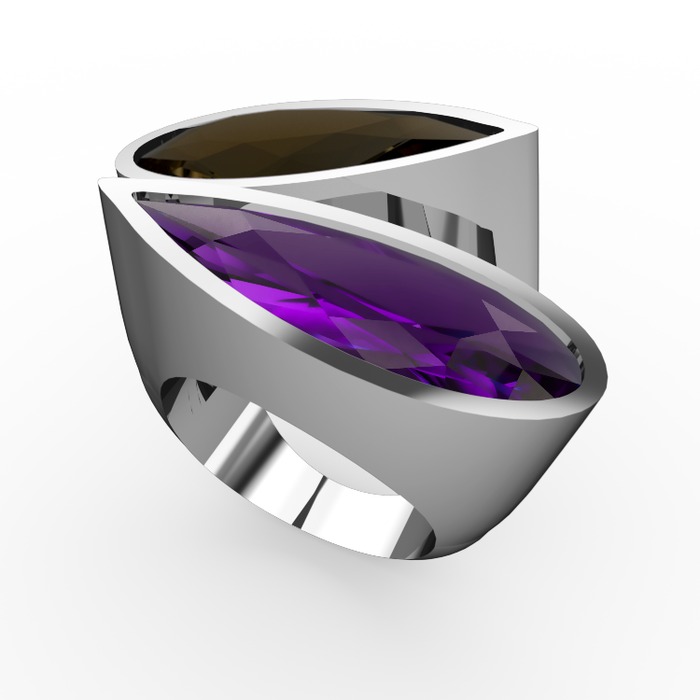 Dumanlı kuvars ve ametist 14 ayar beyaz altın yüzük