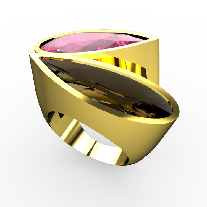 Pembe kuvars ve dumanlı kuvars 14 ayar altın yüzük