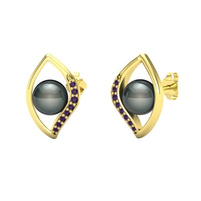 Siyah inci ve ametist 925 ayar altın kaplama gümüş küpe