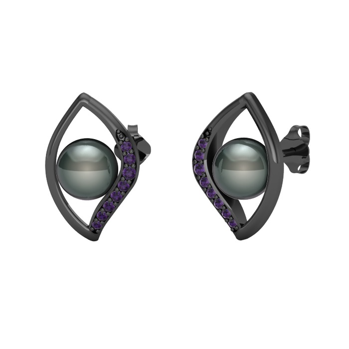 Siyah inci ve ametist 925 ayar siyah rodyum kaplama gümüş küpe