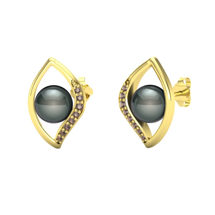 Siyah inci ve dumanlı kuvars 14 ayar altın küpe