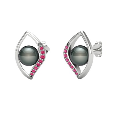 Siyah inci ve rodolit garnet 18 ayar beyaz altın küpe