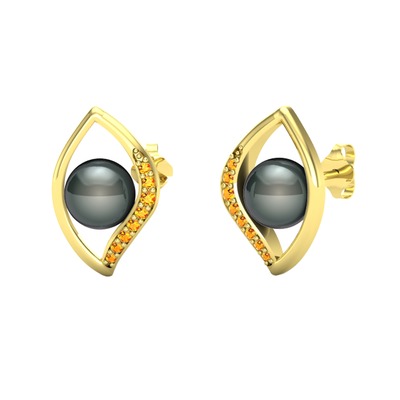 Siyah inci ve sitrin 8 ayar altın küpe