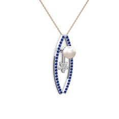 Pembe kuvars, lab safir ve inci 14 ayar beyaz altın kolye (40 cm gümüş rolo zincir)