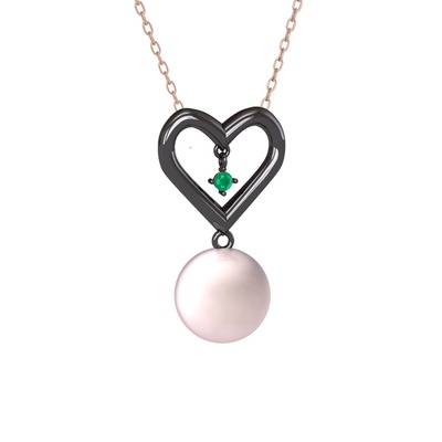 Pembe inci ve kök zümrüt 925 ayar siyah rodyum kaplama gümüş kolye (40 cm rose altın rolo zincir)