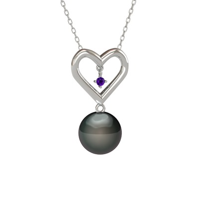 Siyah inci ve ametist 14 ayar beyaz altın kolye (40 cm beyaz altın rolo zincir)