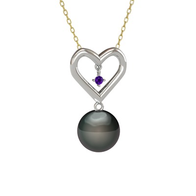 Siyah inci ve ametist 14 ayar beyaz altın kolye (40 cm gümüş rolo zincir)