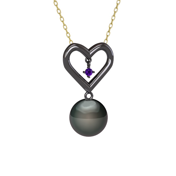Siyah inci ve ametist 925 ayar siyah rodyum kaplama gümüş kolye (40 cm altın rolo zincir)