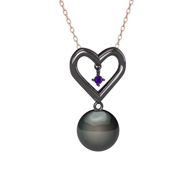 Siyah inci ve ametist 925 ayar siyah rodyum kaplama gümüş kolye (40 cm rose altın rolo zincir)