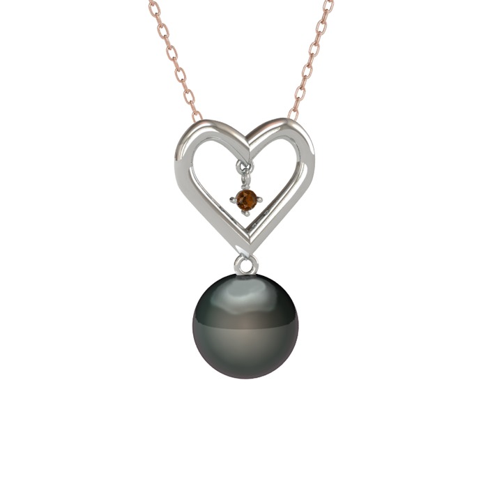 Siyah inci ve dumanlı kuvars 8 ayar beyaz altın kolye (40 cm rose altın rolo zincir)