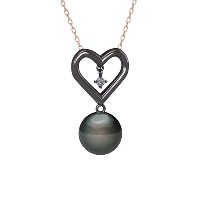 Siyah inci ve elmas 925 ayar siyah rodyum kaplama gümüş kolye (0.036 karat, 40 cm rose altın rolo zincir)