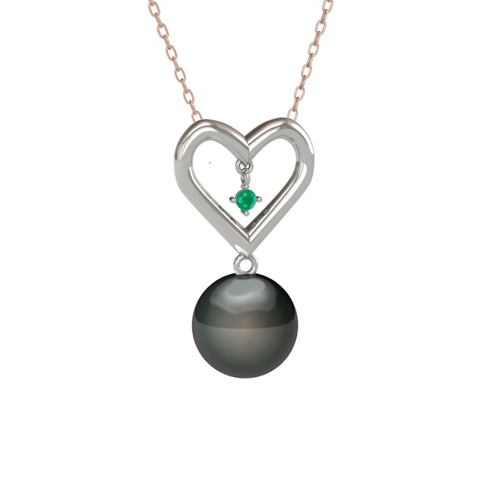Siyah inci ve kök zümrüt 18 ayar beyaz altın kolye (40 cm rose altın rolo zincir)