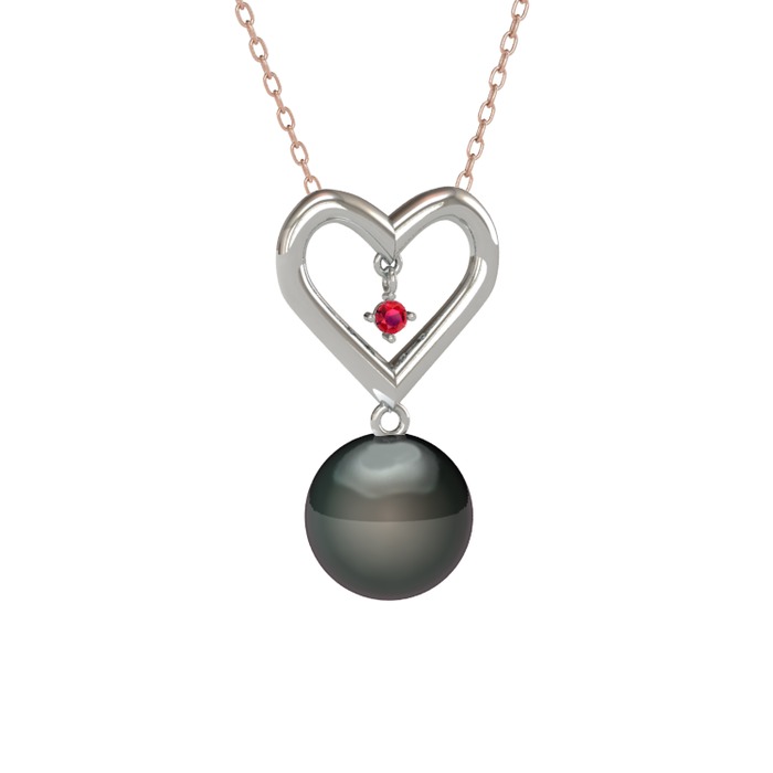 Siyah inci ve rodolit garnet 14 ayar beyaz altın kolye (40 cm rose altın rolo zincir)