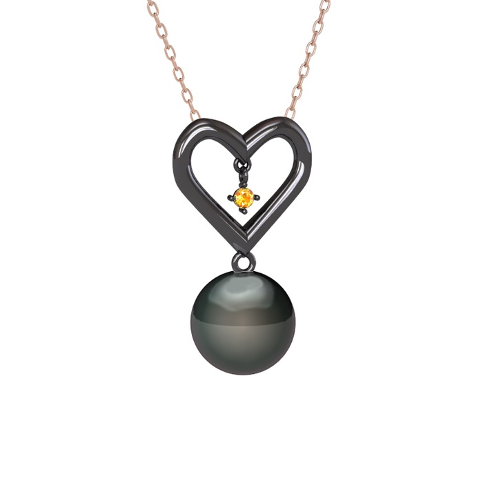 Siyah inci ve sitrin 925 ayar siyah rodyum kaplama gümüş kolye (40 cm rose altın rolo zincir)