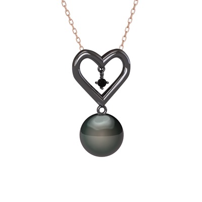 Siyah inci ve siyah zirkon 925 ayar siyah rodyum kaplama gümüş kolye (40 cm rose altın rolo zincir)