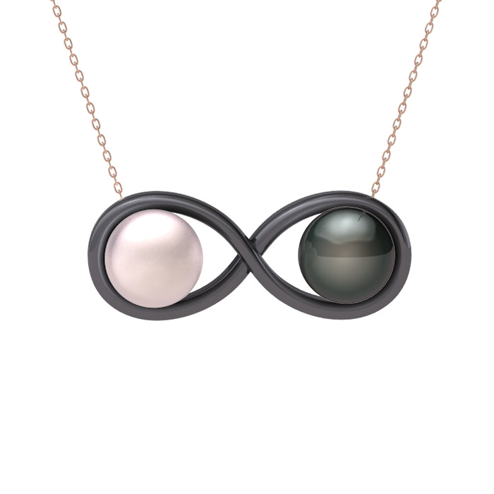 Pembe inci ve siyah inci 925 ayar siyah rodyum kaplama gümüş kolye (40 cm rose altın rolo zincir)