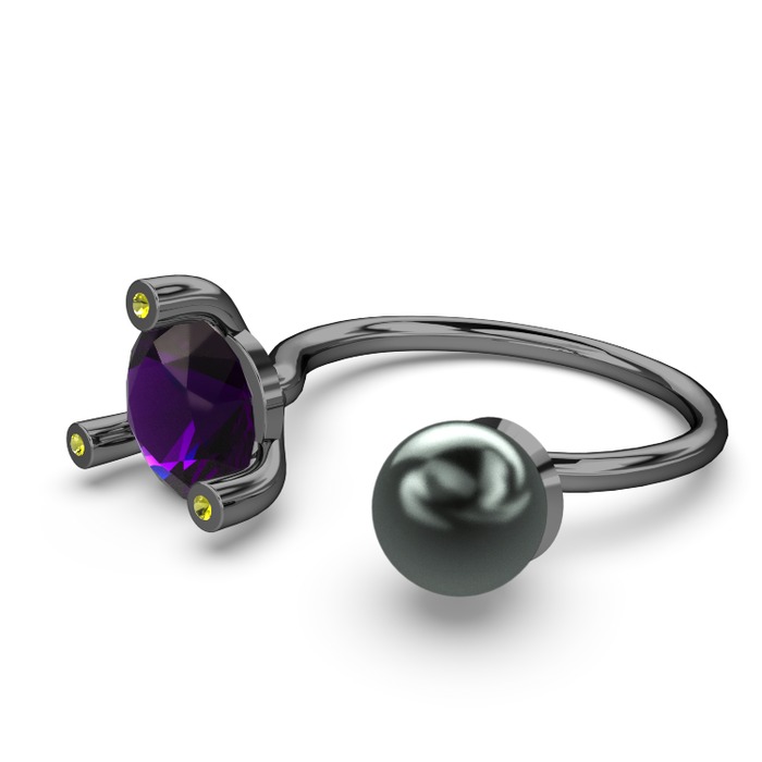 Siyah inci, ametist ve peridot 925 ayar siyah rodyum kaplama gümüş yüzük