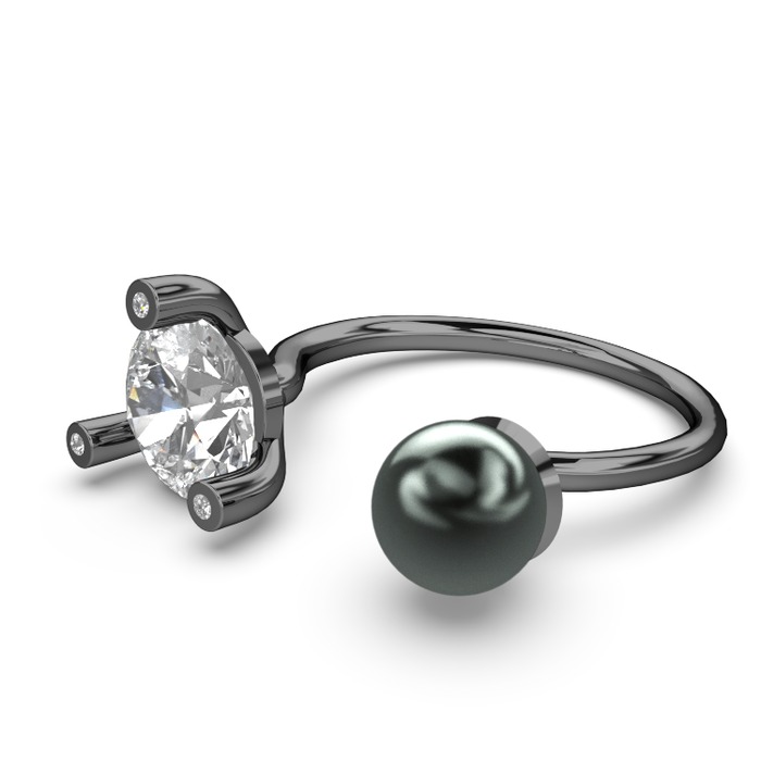 Siyah inci, beyaz zirkon ve pırlanta 925 ayar siyah rodyum kaplama gümüş yüzük (0.024 karat)