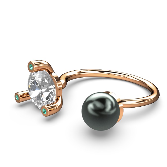 Siyah inci, beyaz zirkon ve yeşil kuvars 14 ayar rose altın yüzük
