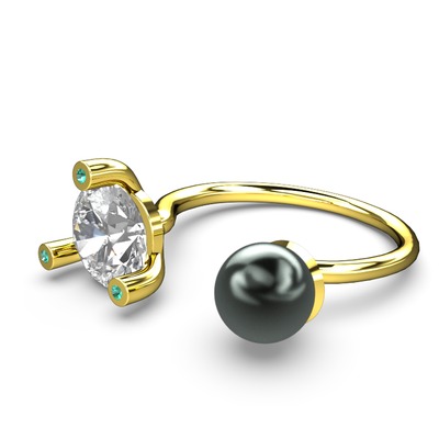 Siyah inci, beyaz zirkon ve yeşil kuvars 18 ayar altın yüzük
