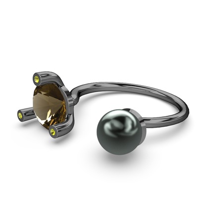 Siyah inci, dumanlı kuvars ve peridot 925 ayar siyah rodyum kaplama gümüş yüzük