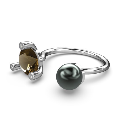 Siyah inci, dumanlı kuvars ve pırlanta 18 ayar beyaz altın yüzük (0.024 karat)