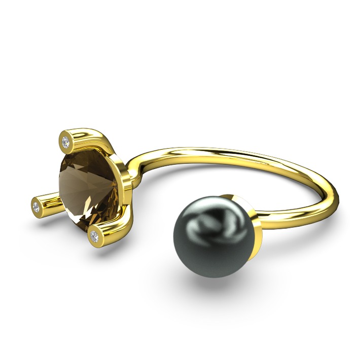 Siyah inci, dumanlı kuvars ve pırlanta 925 ayar altın kaplama gümüş yüzük (0.024 karat)