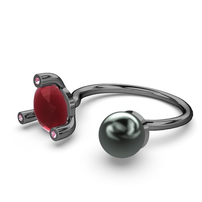 Siyah inci, kök yakut ve pembe kuvars 925 ayar siyah rodyum kaplama gümüş yüzük