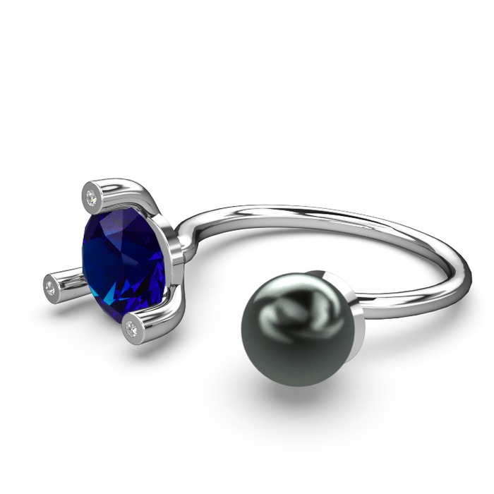 Siyah inci, lab safir ve pırlanta 14 ayar beyaz altın yüzük (0.024 karat)