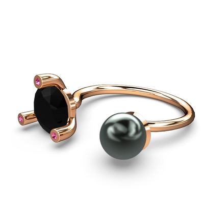 Siyah inci, siyah zirkon ve rodolit garnet 925 ayar rose altın kaplama gümüş yüzük