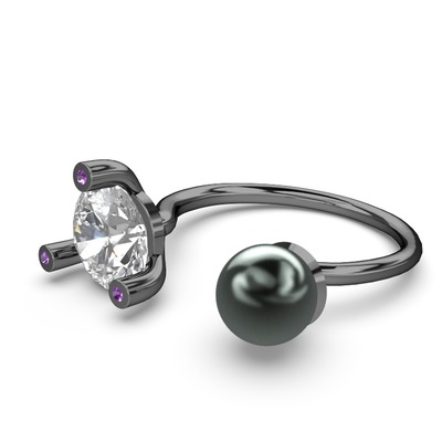 Siyah inci, swarovski ve ametist 925 ayar siyah rodyum kaplama gümüş yüzük