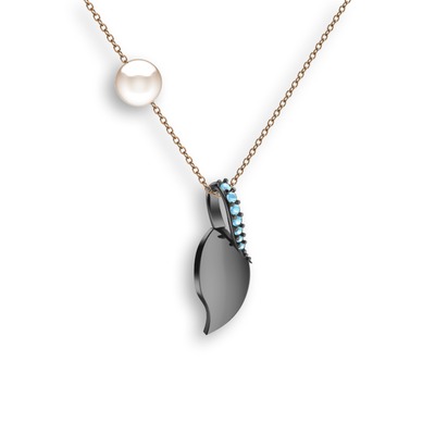 Akuamarin ve inci 925 ayar siyah rodyum kaplama gümüş kolye (40 cm rose altın rolo zincir)