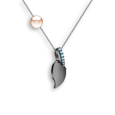 Akuamarin ve pembe inci 925 ayar siyah rodyum kaplama gümüş kolye (40 cm beyaz altın rolo zincir)