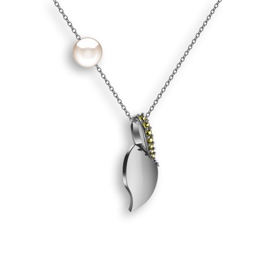 Peridot ve inci 8 ayar beyaz altın kolye (40 cm gümüş rolo zincir)