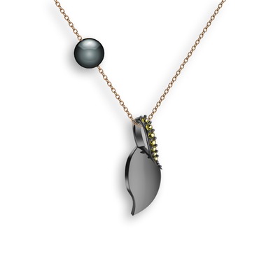 Peridot ve siyah inci 925 ayar siyah rodyum kaplama gümüş kolye (40 cm rose altın rolo zincir)
