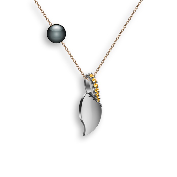 Sitrin ve siyah inci 14 ayar beyaz altın kolye (40 cm rose altın rolo zincir)