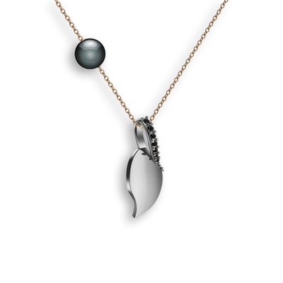 Siyah zirkon ve siyah inci 14 ayar beyaz altın kolye (40 cm rose altın rolo zincir)