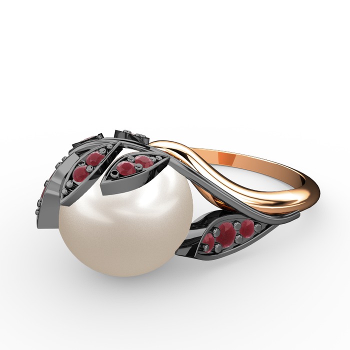 İncili Yaprak Yüzük - Inci ve kök yakut 925 ayar siyah rodyum kaplama gümüş yüzük
