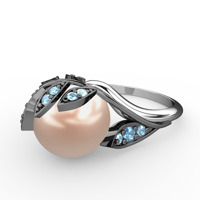 İncili Yaprak Yüzük - Pembe inci ve akuamarin 925 ayar siyah rodyum kaplama gümüş yüzük