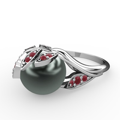 Siyah inci ve kök yakut 8 ayar beyaz altın yüzük