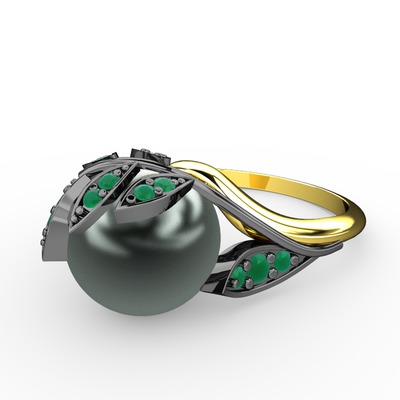 Siyah inci ve kök zümrüt 925 ayar siyah rodyum kaplama gümüş yüzük