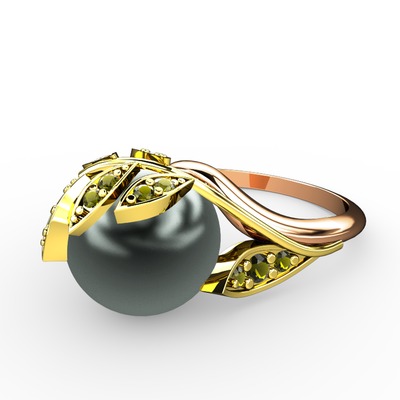 Siyah inci ve peridot 14 ayar altın yüzük