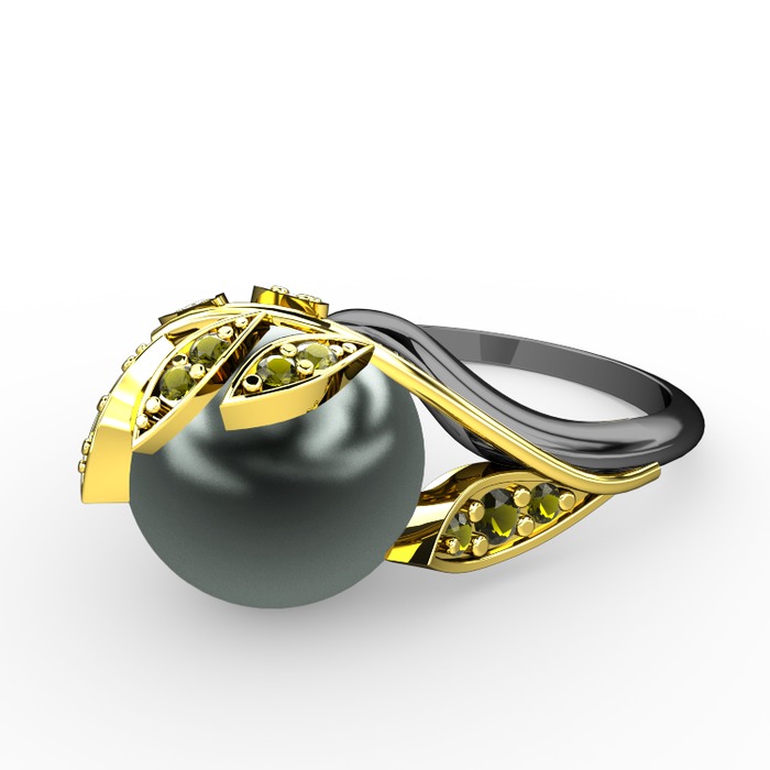 Siyah inci ve peridot 14 ayar altın yüzük
