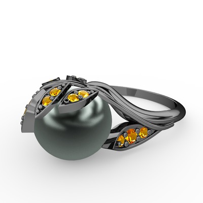 Siyah inci ve sitrin 925 ayar siyah rodyum kaplama gümüş yüzük