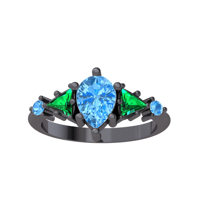 Akuamarin ve yeşil kuvars 925 ayar siyah rodyum kaplama gümüş yüzük