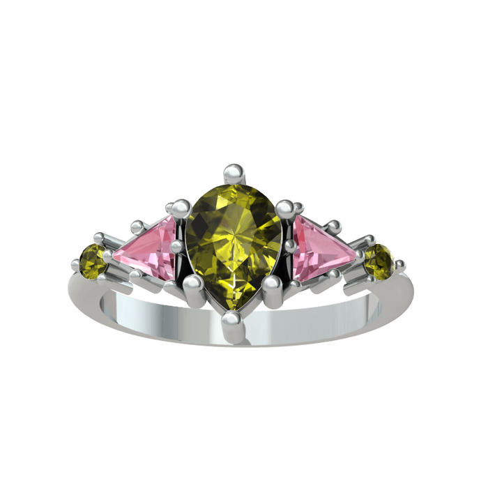 Peridot ve pembe kuvars 14 ayar beyaz altın yüzük